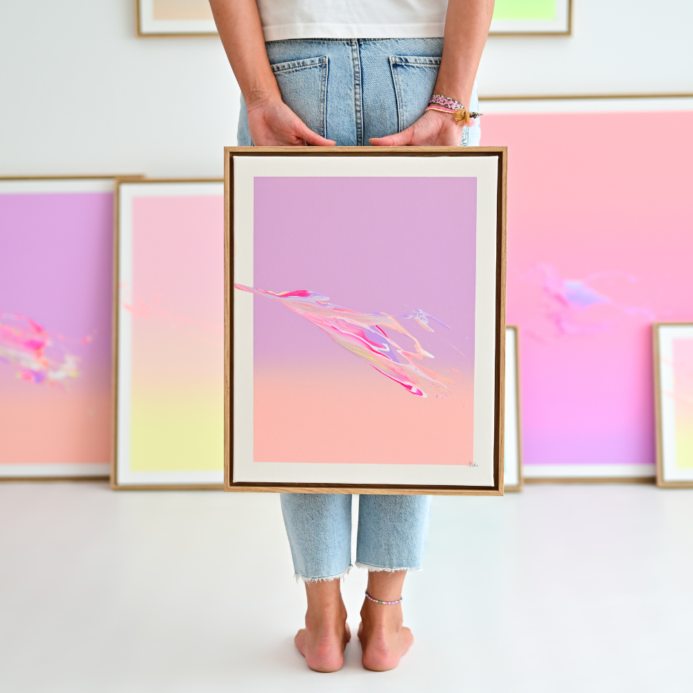 Die Werke von Käthe sind farbige Oasen für die Seele – moderne, minimalistische Bildwelten, in denen energiegeladene Pastell- und Neonakzente auf zarte Farbverläufe treffen. Inspiriert von der Magie natürlicher Lichtmomente, insbesondere der beruhigenden Schönheit von Sonnenuntergängen, schafft Käthe mit ihrer Kunst Räume voller Ruhe, Gelassenheit und positiver Energie.
